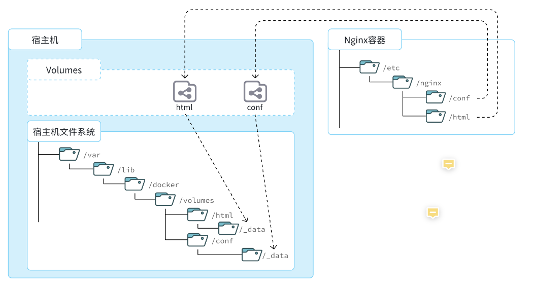 - 而数据卷conf和html分别指向了宿主机的
