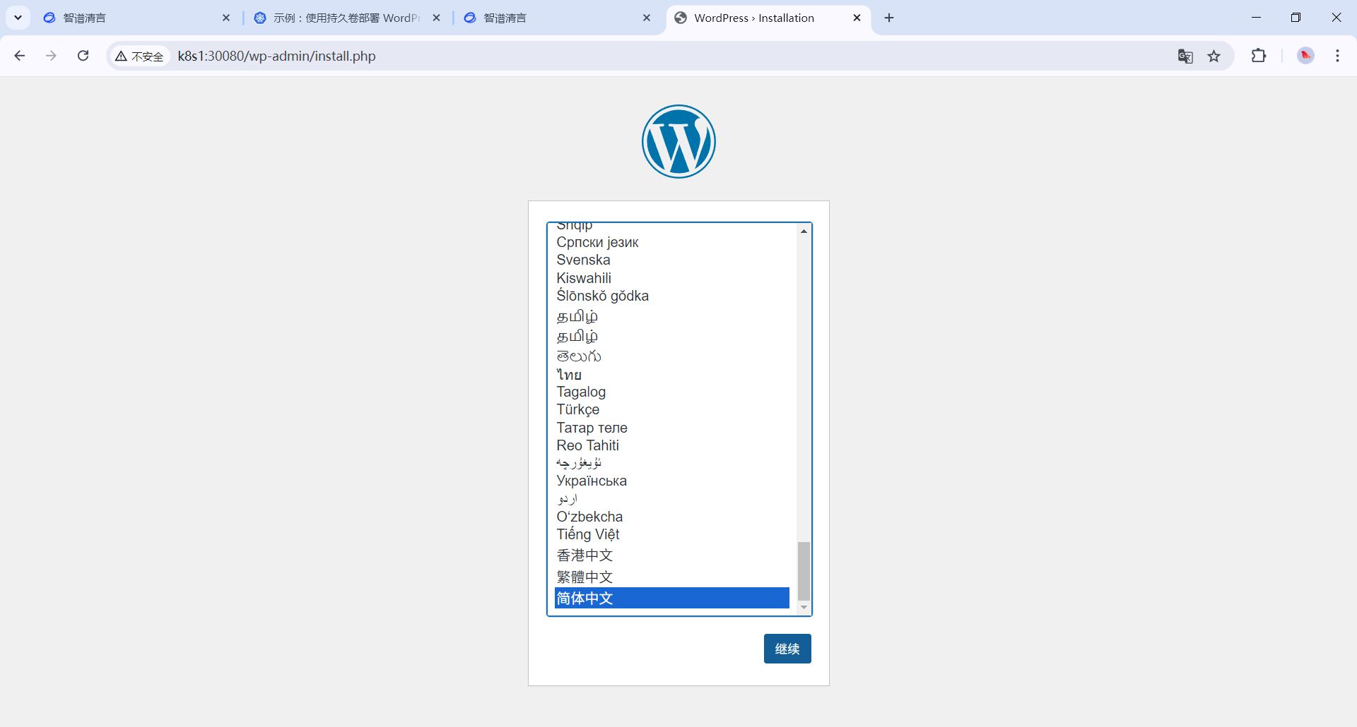 在浏览器中查看wordPress状态(在wordpress的service文件中指定了端口为30080),访问k8s1:30080(改成你的k8s集群上的节点ip:指定的端口)